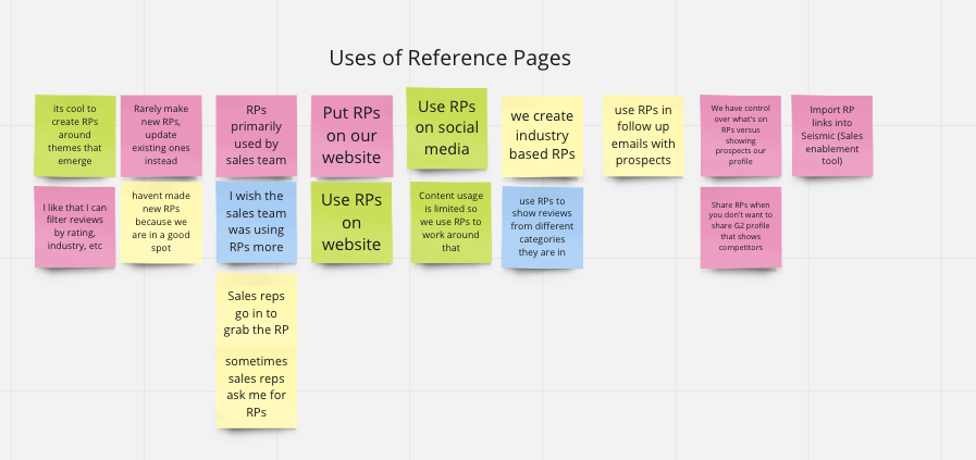 From the Miro board, there were a lot of unanswered questions we had about the value Reference Pages was bringing (or not) to customers. The next step was to start interviewing real G2 customers!