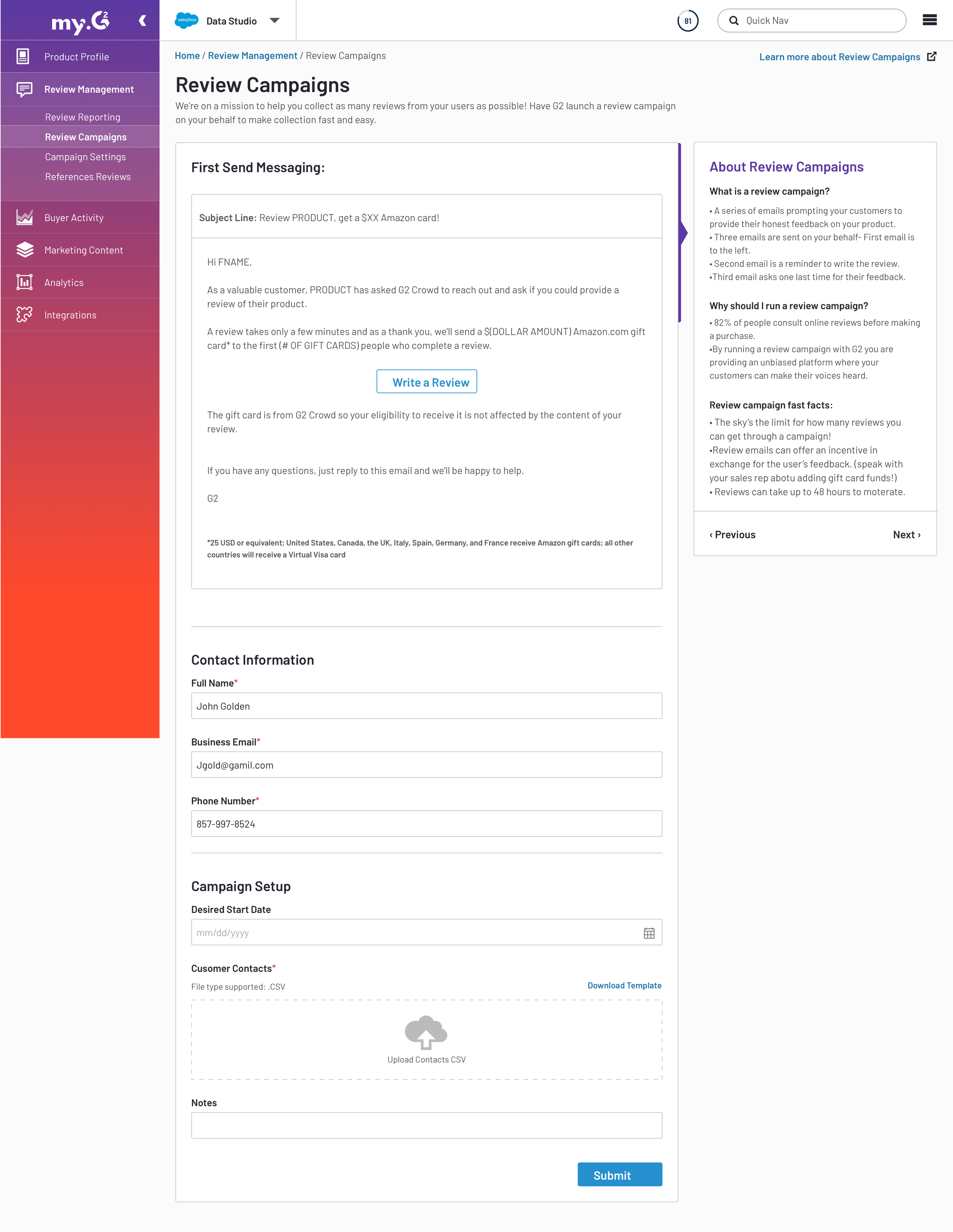 I consulted with one of the managers of the Outreach team to confirm every bit of information they need in order to fulfill the review campaign request to avoid as much back and forth between G2 and the user.
