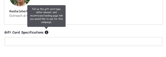 Missing important information needed from the user (i.e. gift card $ amount, gift card type, landing page link).